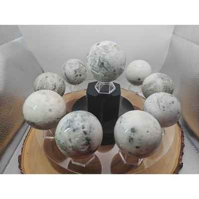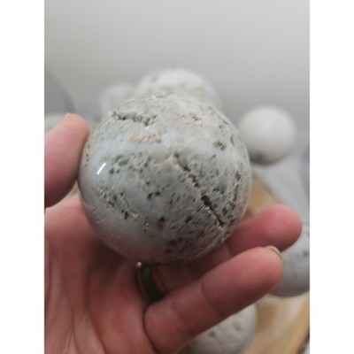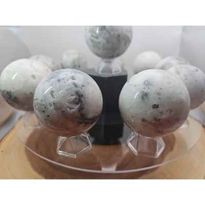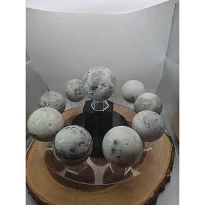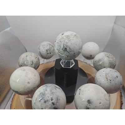 This product is a natural golden pyrite and jasper crystal sphere ball polished to a diameter of 55mm+. The sphere is made of natural stones such as jasper, jade, and agate tourmaline, all sourced from Madagascar. The unique shape and natural beauty of the stone make it a perfect addition to any crystal or mineral specimen collection. Each sphere is handcrafted and polished to a high shine, showcasing the natural beauty of the stone.