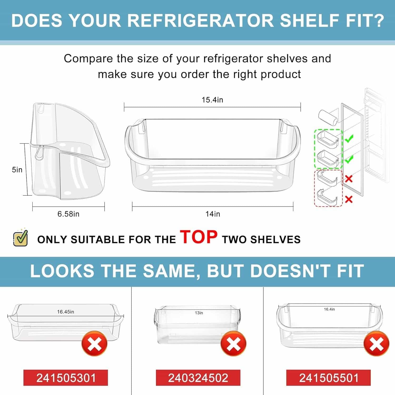Only fits top 2 Shelves15.38″, Front Height: 5″, Depth: 6.65″. Does not fit 240324502, 240363702, 216959802, 241505501, 241505301. Please check your refrigerator door shelf size carefully before purchasing Fits Frigidaire Side-By-Side Refrigerator: FFSS2615TE0, LFSS2612TE0, FGHS2631PF4A, FGHS2655PF, FFSS2615TP0, FFSS2615TS2, FFSS2615TS0, LGHX2636TF0, LFSS2612TE2, LGUS2642LF1, LFSS2612TF0, LFSS2612TF2, LFSS2612TF4, LFSS2612TP0, LFUS2613LE0, LGHX2636TF5, LGHX2636TFB etc. To save your time and avoid making a purchase mistake, make sure the model matches before you buy 240356402 Refrigerator door shelf replaces 240356407, 240356408, 240356410, 240356411, 240356413, 240356414, 240356415, 240356416, 240430305, 240430307, 240430311, 240430312, 241808205, 241808206, 241808221, 891214, AP2549958, PS430122, EAP430122 etc. Only for side-by-side refrigerator models with 2 shelves on the top side of the refrigerator (Door Shelf Bin Upper)