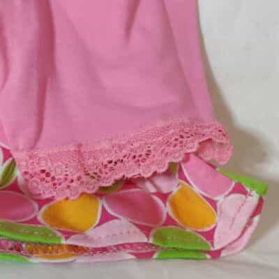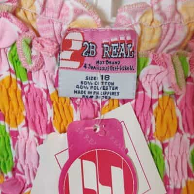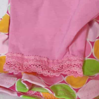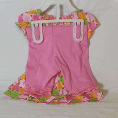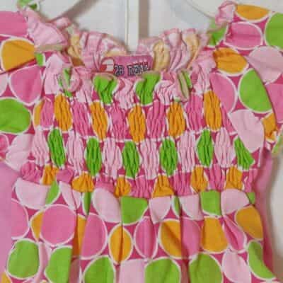 Adorable smocked top in mint green, orange sherbet and shades of pink and paired with a sweet little pair of capri pants with lace edging!