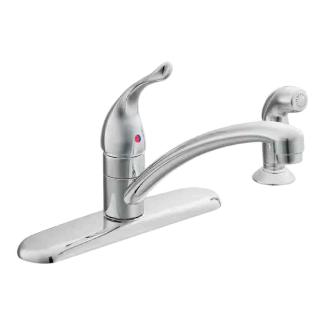 Defined by attractive simplicity, this standard kitchen faucet offers timeless style with dependable everyday performance. Its sleek, gently curved profile and over 9 in. spout reach, along with a matching side spray, create a practical design that is easy to install and use. The chrome finish provides a clean, classic appearance that complements a wide range of kitchen styles.
