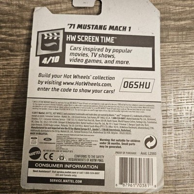 Hot Wheels ’71 Mustang Mach 1 007 Hot Wheels Screen Time 3/250 #4/10. 2017 Mattel. Good Used Condition. ITEM #2072 Some cards may have soft corner or slight bend or minimal damage to text on back of card. We hope that you will follow us so that you may see the variety of items that we have to sell. We cross post. You can find us at KT Doering, Bargains by K & T LLC, Bargains by KT, bargainsbykt.