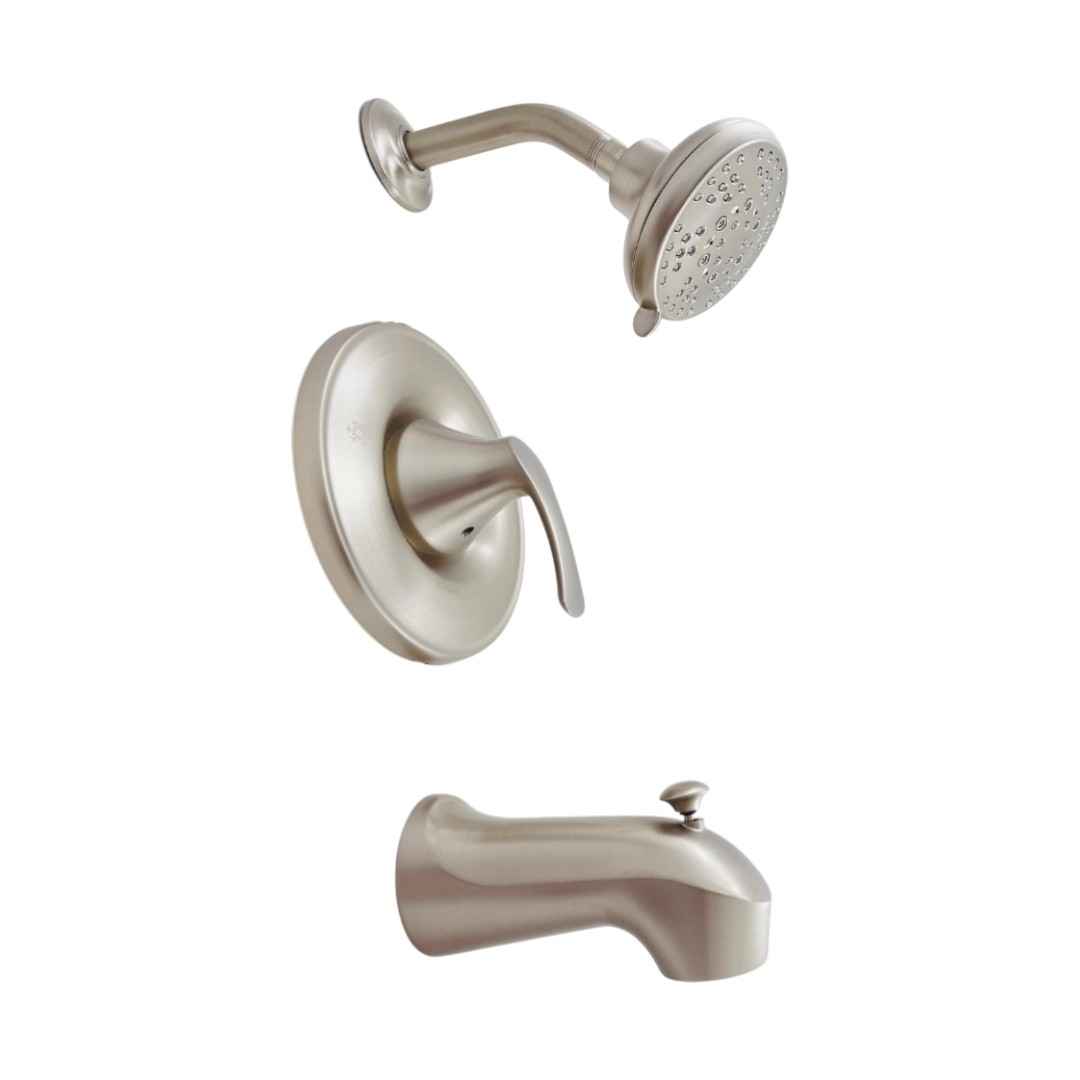 This 1-handle tub and shower faucet set combines reliable performance with a clean, modern look. The included 5-function showerhead lets each user choose their preferred spray setting. A spot-proof  brushed nickel finish helps reduce fingerprints and water spots for easier maintenance. The showerhead is Water Sense certified to help conserve water while maintaining strong performance.