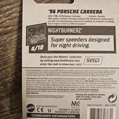 Hot Wheels ’96 Porsche Carrera Night Burnerz #155/250 4/10. Good Used Condition. ITEM #2073 2017 Matttel. Some cards may have soft corner or slight bend or minimal damage to text on back of