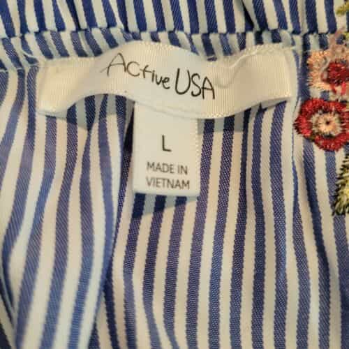 Pretty blue & white vertical striped on or off the shoulder top with embroidered flowers!
