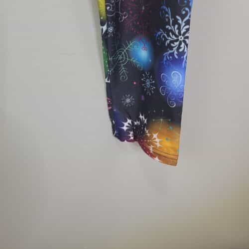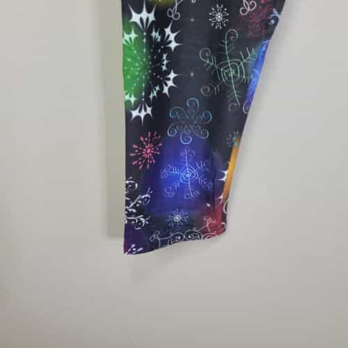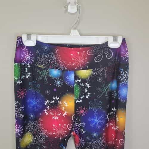 Soft and comfy pair of leggings made of polyester and spandex with pretty rainbow snowflake print and a wide waistband!