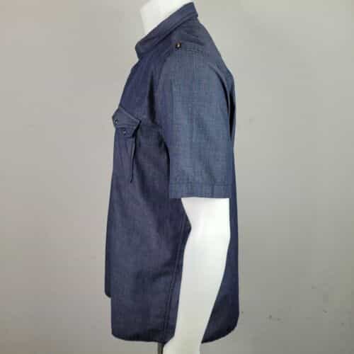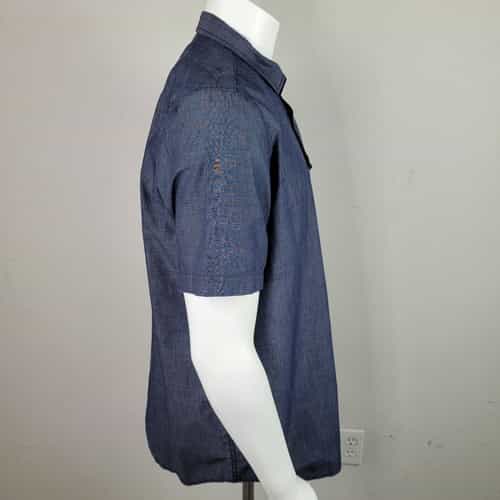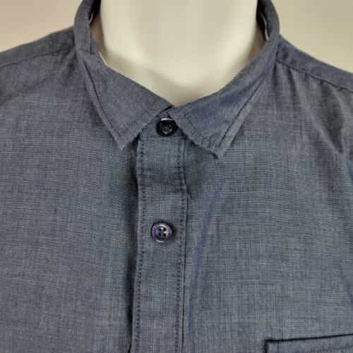 Blue-gray button front collared shirt with a single breast pocket! The single pocket closes with a double flap with a snap on each side and there is a signature snap at the bottom of the button panel! A great shirt for dress-up or casual!