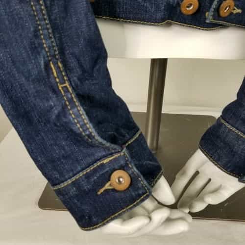 Stylish blue denim button front jacket with adjustable button waist! Bottom half of sleeves lined with plaid fabric so you can roll the sleeves up for a little different look!