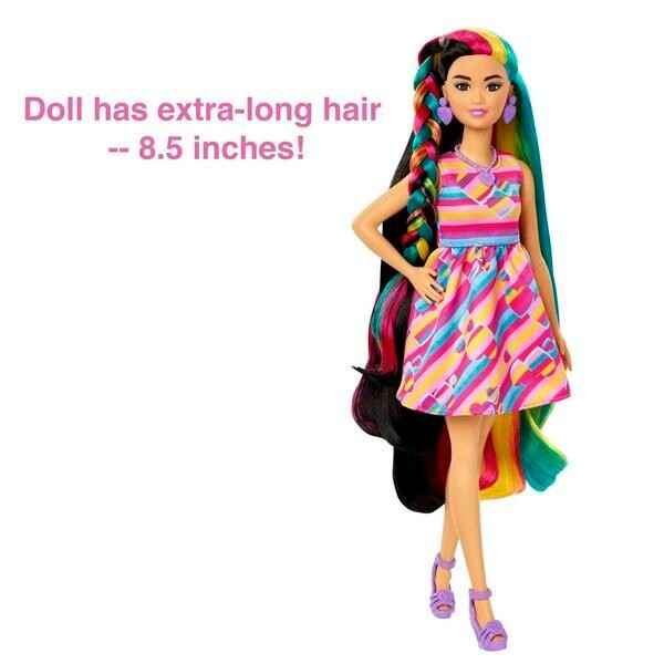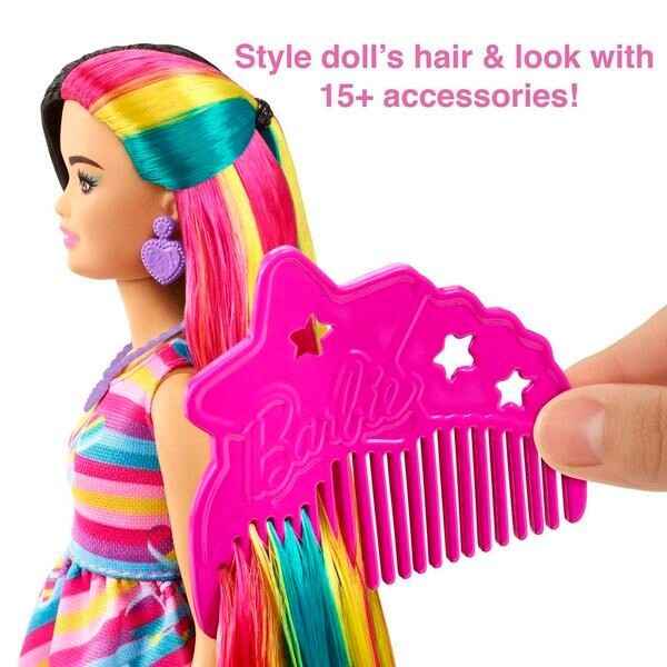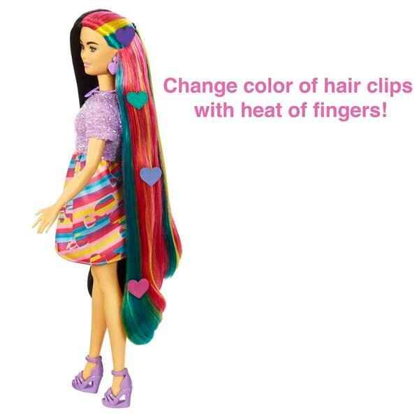 Inspired by the best-selling Barbie® doll that first made waves 30 years ago, the Barbie® Totally Hair™ star-themed doll rocks her own hairstyle, hair texture and fashion look! The doll has 8.5 inches of extra-long playable hair and comes with 15+ additional pieces including 8 color change hair clips, accessories and an extra fashion. Barbie® doll has an original body shape and comes with side-swept bangs as a nod to the original Barbie® Totally Hair™ doll plus has beautiful purple and blue highlights. She wears a star-printed dress with puffed sleeve detail. Kids will love creating different hairstyles and the endless styling possibilities!