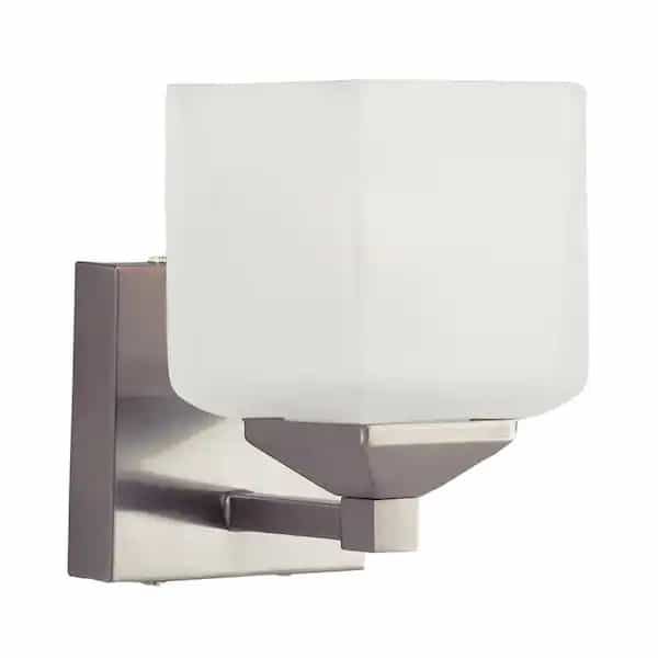 The Edwards Collection from Bel Air offers wall lights with a sleek, transitional look designed to provide functional and decorative illumination to your home. The Edwards wall sconce provides task lighting and area lighting for smaller sized bathroom and powder room spaces. The piece features a simple square wall plate that holds a single frosted glass shade. The square shade is open at the top to allow for easy access to change the bulb, and for directional illumination either above or below as the fixture can be mounted with the shade facing up or down. This wall light offsets the frosted glass with a metallic pewter finish, adding a contemporary feel and allowing the piece to blend seamlessly with chrome and nickel bathroom hardware. Mount the Edwards wall sconce in bathrooms on either side of a vanity mirror, or use in hallways, near artwork, or wherever additional accent lighting is needed.