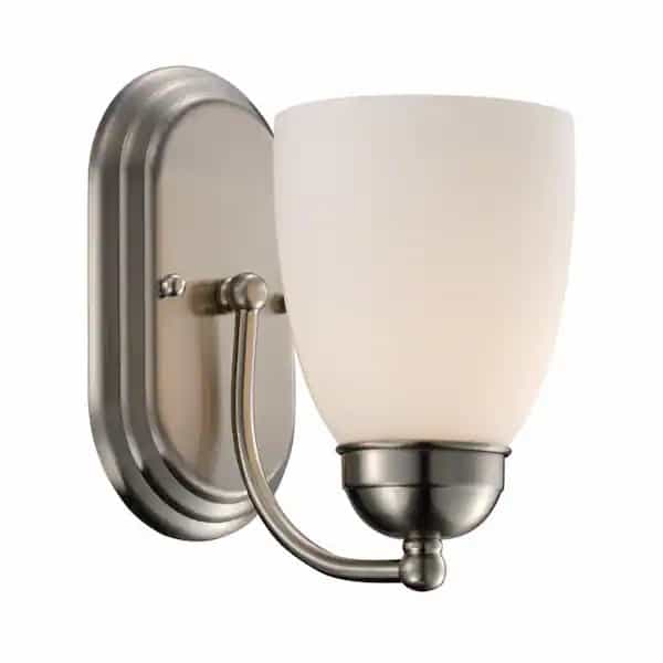 The Clayton Collection is a decorative way to bring light into your bathroom or powder room. The Clayton 6 inch wide wall sconce offers both accent lighting and supplemental task lighting as it stands out and showcases your home’s interior. This one light fixture has a white frosted glass curved shade that is open at the bottom to allow easy access to the single 60-watt bulb inside. The classic brushed nickel finish is easy to coordinate with existing hardware and nickel finishes. The Clayton wall light is easy to install with the shade in the up or down position for directional light.