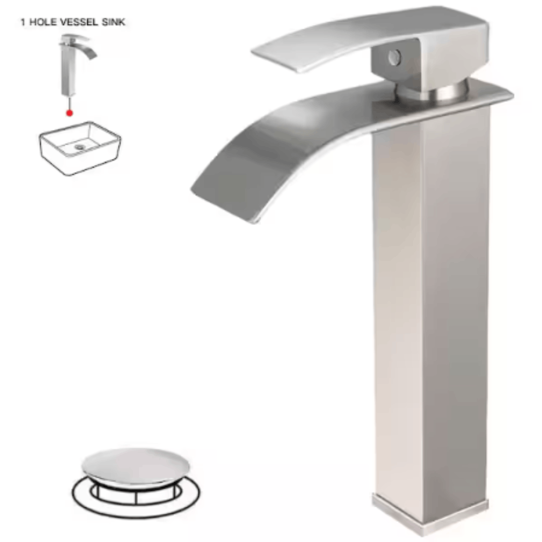 - Stainless Steel Construction: Made from high-quality 304 stainless steel, this black vessel sink faucet features a waterfall spout that creates a beautiful flow of water, offering both style and functionality. The brushed nickel finish resists corrosion and rust, is fingerprint-resistant, and enhances the overall comfort and appearance of your bathroom.