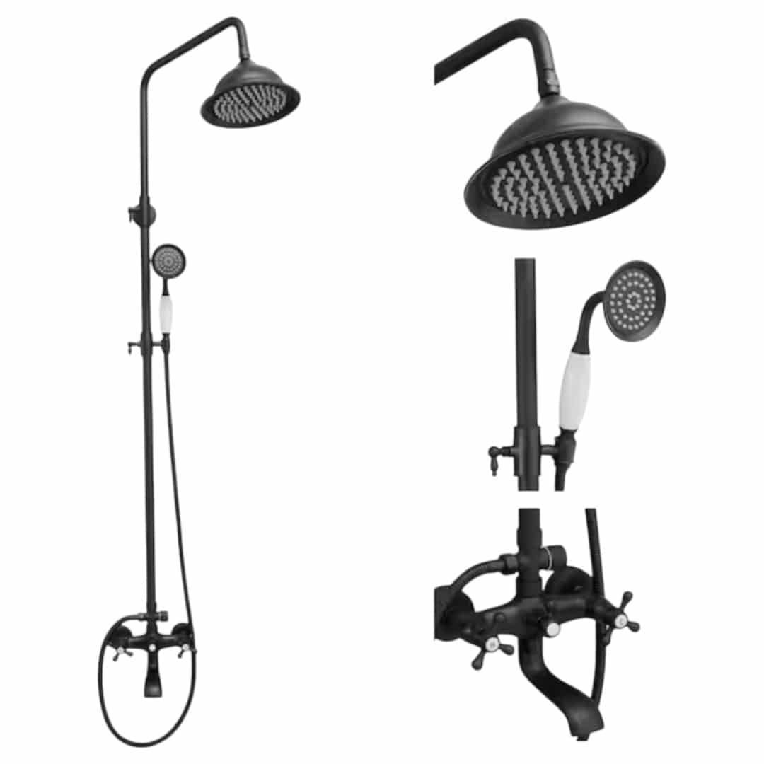 Upgrade your bathroom with this Wall Mounted Classic Matte Black Exposed Shower Brass Pipe Faucet Combo Set. Featuring vintage double cross knobs and refined detailing, this shower system combines elegance with functionality. The included hand shower enhances your everyday bathing experience.