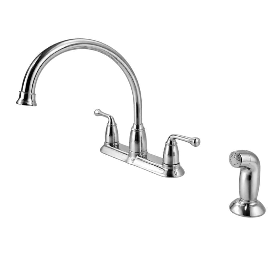 This 2-handle kitchen faucet with side sprayer features a traditional design that complements many kitchen styles. Separate hot and cold handles allow precise temperature control. The included side sprayer is useful for washing large pots and pans and rinsing the sink after use.