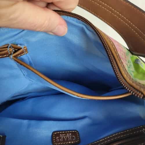 Pretty shoulder bag in a paisley print of spring colors with 2 open inside pockets, 1 zipper inside pocket and 1 zipper outside pocket!