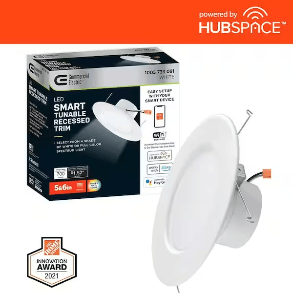 Commercial Electric 6in. SMART LED Recessed Light Trim with Hubspace App is an innovative and entertaining way to illuminate your space. Create subdued romantic lighting or express your dramatic flair. Perfect for holidays, celebrations or whatever your current mood; turn lights down low to a cool blue hue or having a party; turn lights to a popping red, orange or yellow. Set up and manage your device with the Hubspace App which is compatible with Google Home and Amazon Alexa; no HUB required. Now you are ready to create your own unique colorful lighting ambiance. Choose shade of white (2200K-6500K) or select from a full color spectrum. You can even group multiple lights together to control them from up to 30 ft. in your home. For even more convenience, you can set up for voice activation. Ideal for home, office, entertainment areas, restaurant, retail, boutique and much more.