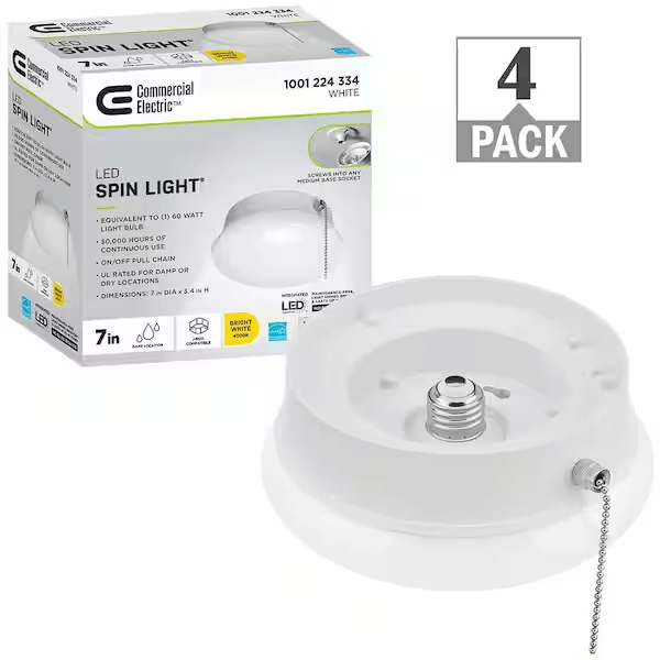 Commercial Electric 7in. Spin Light LED Flush Mount Ceiling Light with Pull Chain is designed to easily screw into most existing plastic and porcelain lamp holders without any wiring required. Converts your lamp holder to a fixture in no time at all. *Direct wire option is available using bracket included in box. For quick activation, use the pull chain for an easy grab. It has a superior long lasting light engine and maintenance free with no bulbs to replace. Ideal for closets, bathrooms, pantry, hallway, stairway, laundry room, basement, attic, garage, storage room.