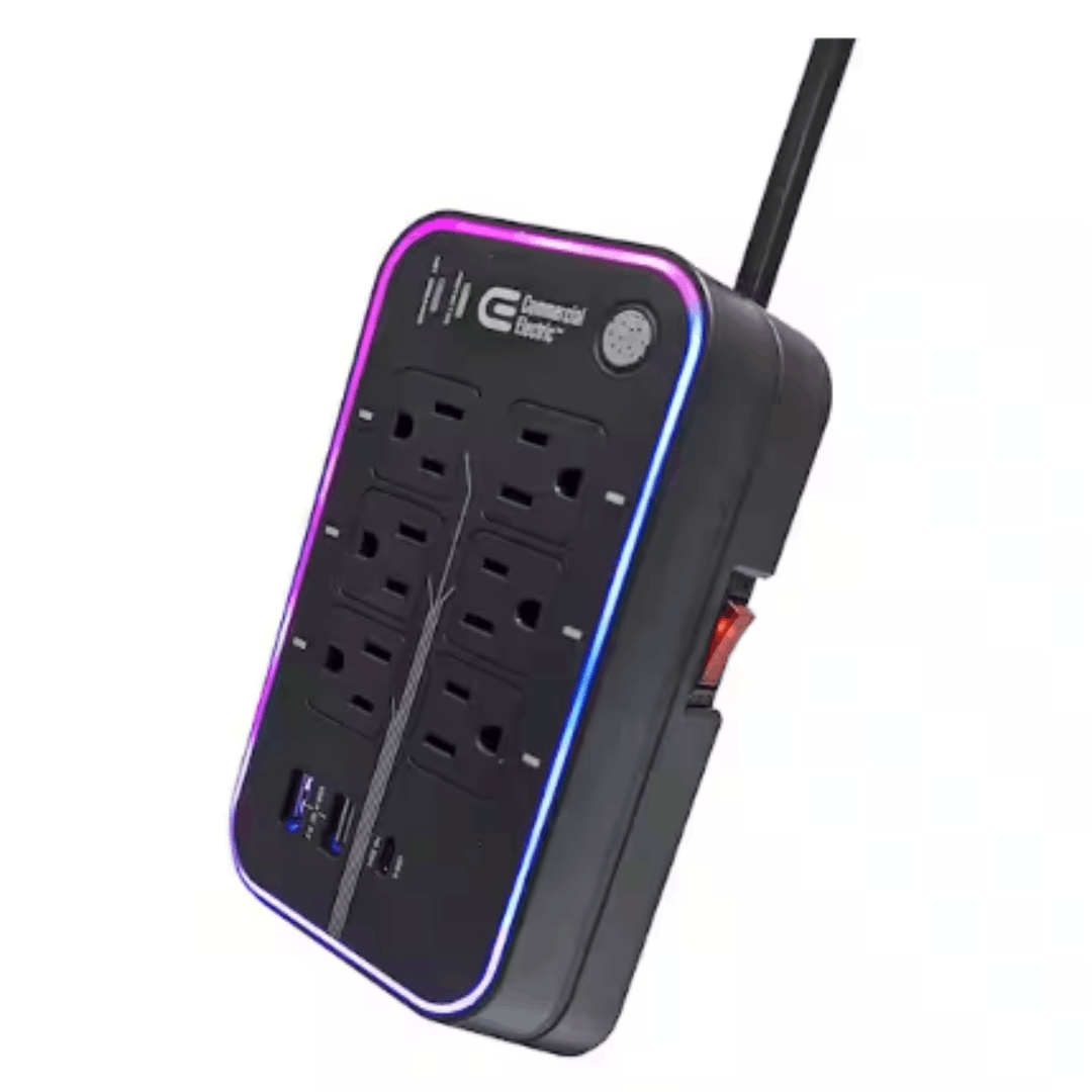 Enhance your gaming experience with the 6-Outlet 2 USB-A 1 USB-C RGB Gaming Surge Protector. Designed to complement gaming setups, this surge protector is perfect for powering your gaming PC, monitor, mouse, and keyboard. Featuring RGB lighting, it seamlessly fits with your gaming gear while meeting your power extension needs.