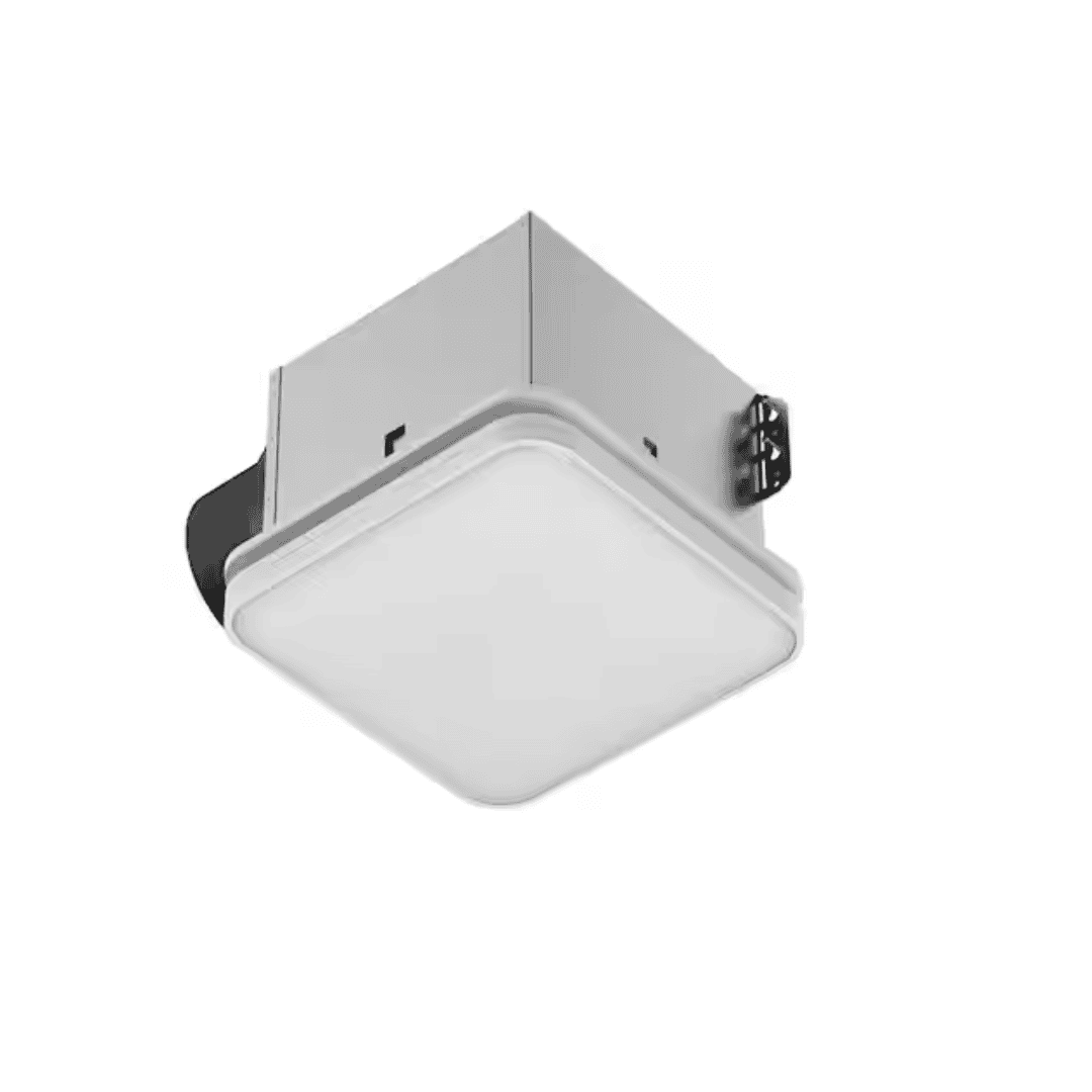 This ultra-quiet bathroom exhaust fan features a modern square design and delivers powerful ventilation suitable for larger room areas. With low sound levels of 0.8/1.0 sones, it provides efficient air movement while maintaining quiet operation. The fan is designed for easy room-side installation, making it ideal for spaces without attic access, and includes a quick drywall template to simplify setup. A flexible bracket mounting system securely attaches the fan housing to ceiling joists.