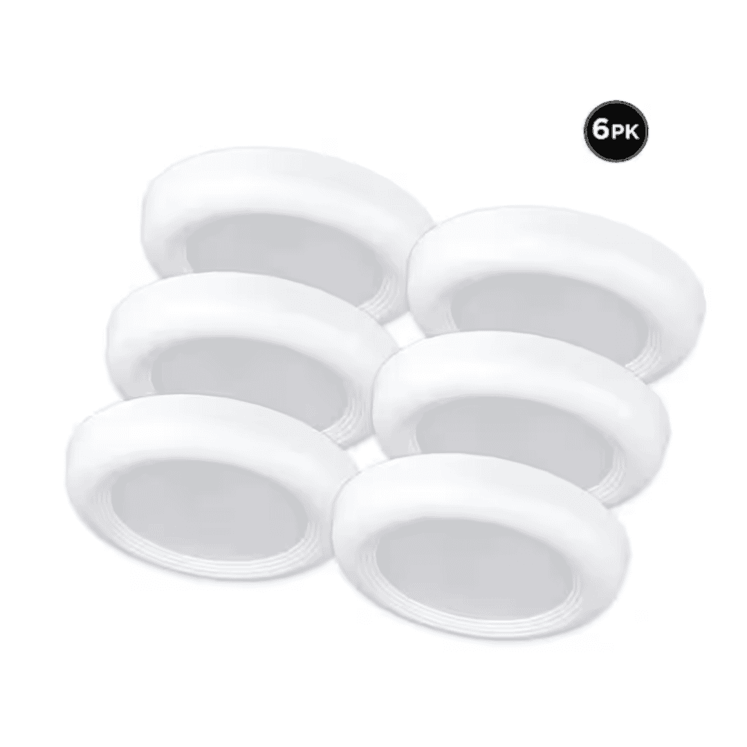 Add clean, modern lighting to your space with this 6 in. white LED disk light set. It is a fast, efficient alternative to recessed cans and traditional flush mounts, providing clear 3000K soft white illumination with quick installation. Designed to mount directly to a standard or pancake junction box, it requires no recessed housing or mounting plate. Ideal for residential areas like kitchens, bathrooms, hallways, and bedrooms, and also works well in commercial spaces such as restrooms, corridors, lobbies, and storage rooms. Includes (6) 6 in. LED disk lights.