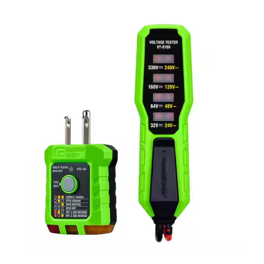 The Commercial Electric KVO-01 features a GFCI Socket Tester with LCD and an AC/DC voltage tester, providing a complete solution for testing electrical outlets and measuring voltage. The GFCI Socket Tester checks wiring conditions at standard 3-wire 120-Volt outlets and inspects GFCI devices. Its LCD screen displays voltage, identifies wiring faults, and shows the time required for a GFCI device to trip.