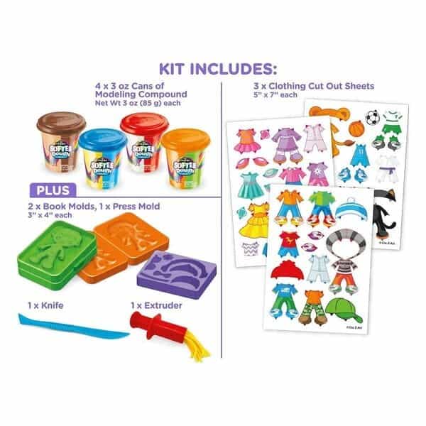 With Cra-Z-Art’s Colors of you & me Softee Dough modeling compound play set, kids will experience the magic of friendship! Simply load super soft Softee Dough into the included adorable character and accessory molds to create fashionable friends you can dress and style with fun clothing cut-out sheets. Mix and match outfits and accessories! Use the handy color chart on the back of the box to create crazy new colors to make a bold fashion statement! Safe and non-toxic, great for girls and boys. Includes 3 cans of multicolor Softee dough with two colors each: brown and black, pink and blue, and yellow and white. Recommended for unisex children ages 3 and up. Be “always creative” with Cra-Z-Art!