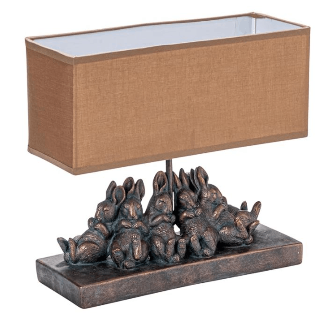 Add charm and personality to your space with this whimsical table lamp featuring a bronze-finish resin base designed as lounging rabbits. The linen shade offers a soft touch, making it a great fit for a child’s room or any area with farmhouse or rustic country decor.