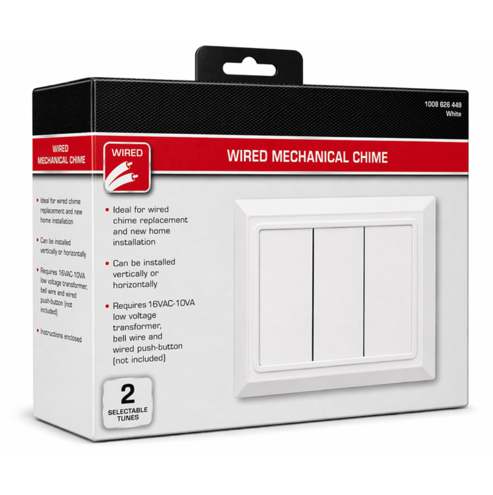 The Wired Door Chime is perfect for new installation or replacing an existing door chime. The low-voltage door chime features a traditional Ding-Dong sound for the front entrance. This chime can be installed vertically or horizontally.