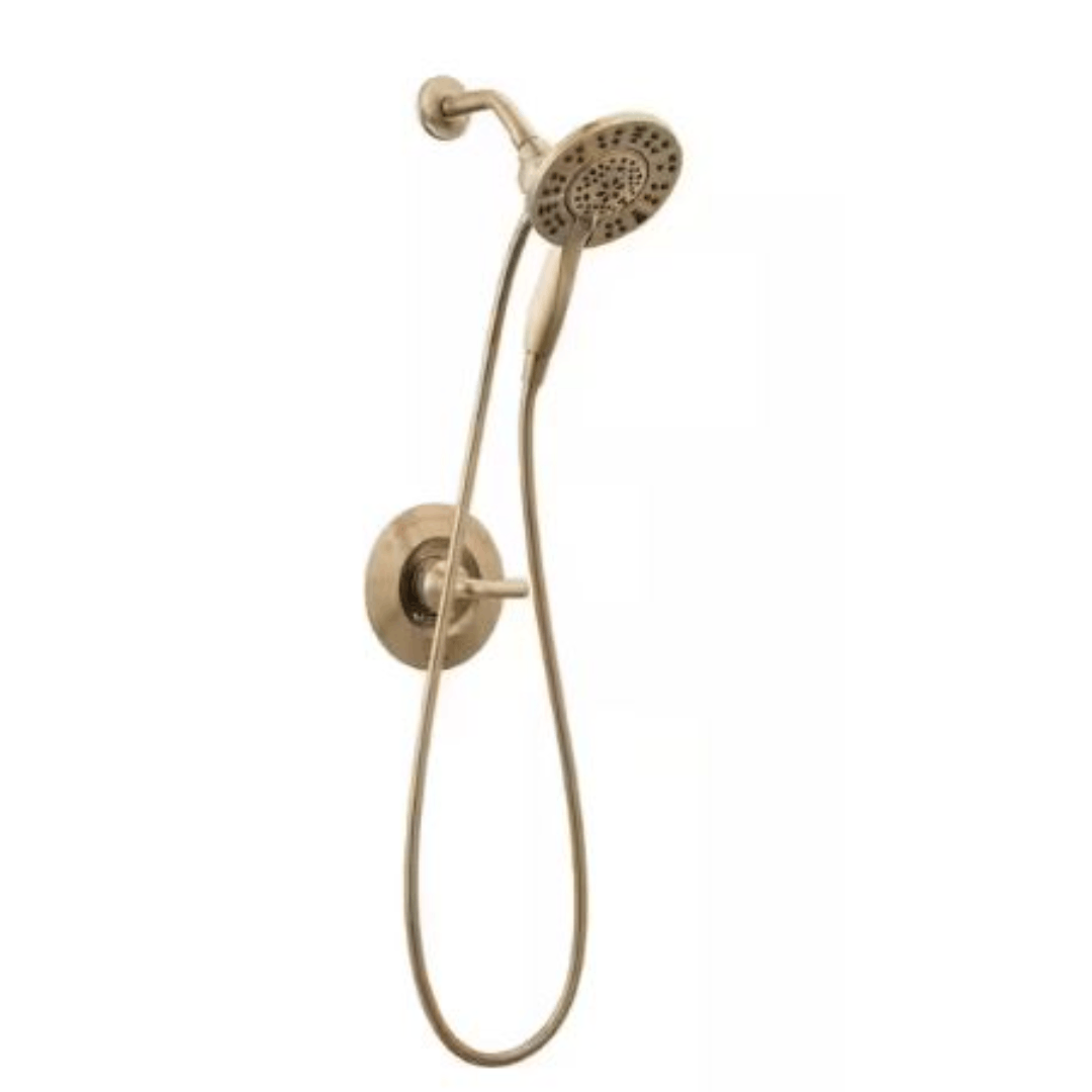 The Arvo Bath Collection features soft, fluid lines that bring a calm and refined look to your bathroom. The Delta In2ition 2-in-1 shower combines a fixed shower head with a detachable hand shower, allowing both to be used separately or together. This flexible setup offers targeted water delivery without sacrificing overall coverage. The spray face includes soft rubber nozzles for easy cleaning, while a pause function provides space for tasks like shaving or lathering while maintaining the water temperature.