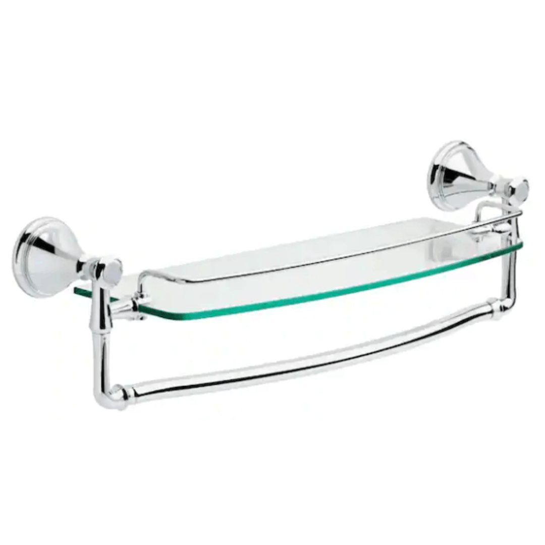 The Delta Cassidy Bath Collection is inspired by the graceful silhouette of a woman, featuring clean lines and sophisticated design elements. Drawing inspiration from classical architecture, this collection combines sleek, curved profiles with elegant detailing. This 18-inch wall-mount towel bar with a clear glass shelf offers both functionality and style. The polished chrome finish, paired with the cooling touch of glass, provides a classic look. The dual-purpose design allows you to hang towels while using the slim shelf for candles, lotions, and other bathroom essentials. Complete your bathroom with coordinating pieces from the full Cassidy collection (sold separately).