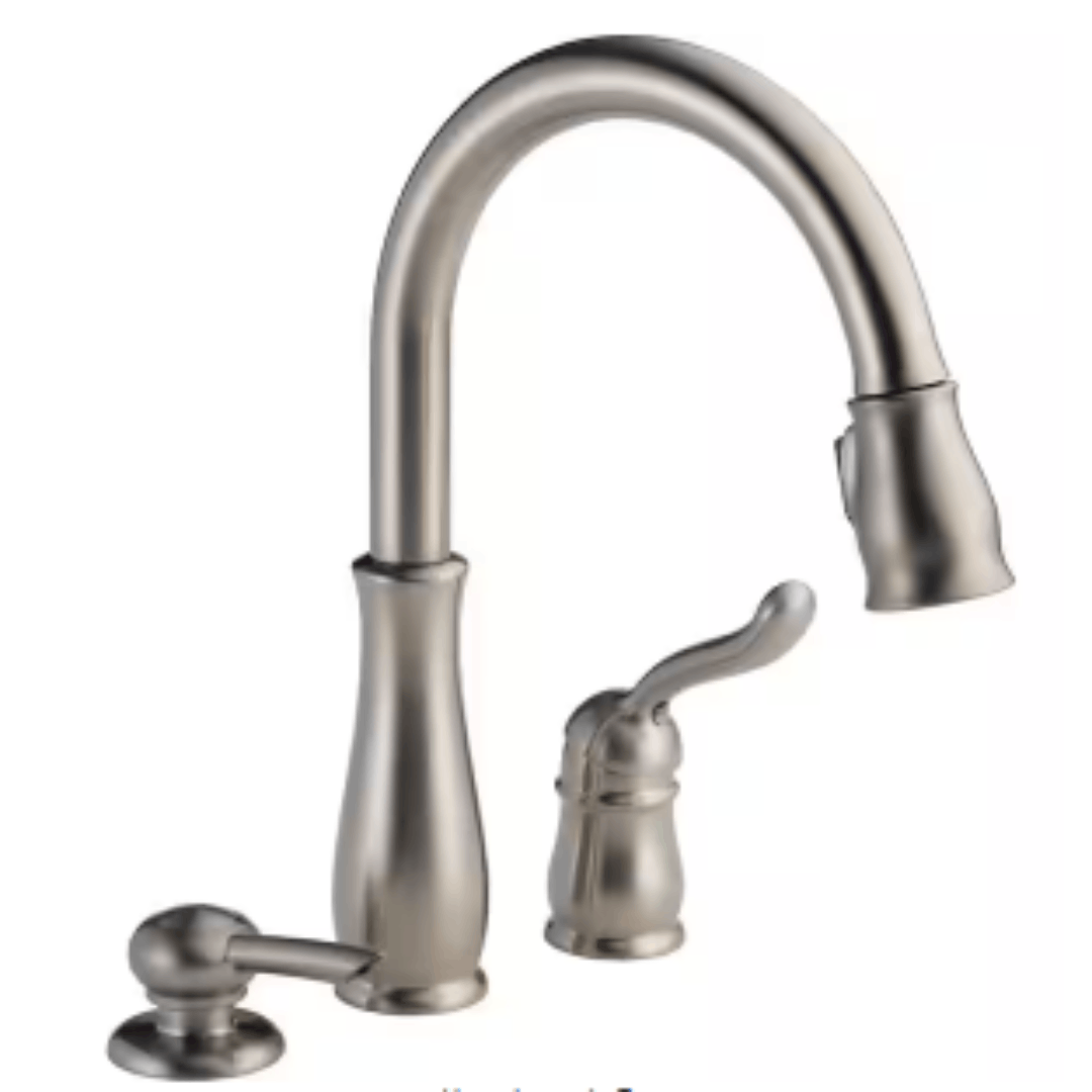 The Delta Leland Single-Handle Pull-Down Sprayer Kitchen Faucet in Stainless Steel delivers the functionality and versatility needed for various cooking and kitchen tasks. With a high-arc spout that swivels 360° and a pull-down spray wand, it ensures efficient cleaning and ease of use. The MagnaTite docking system uses a powerful magnet to keep the spray wand securely in place. Its timeless stainless steel finish complements a wide range of kitchen styles.
