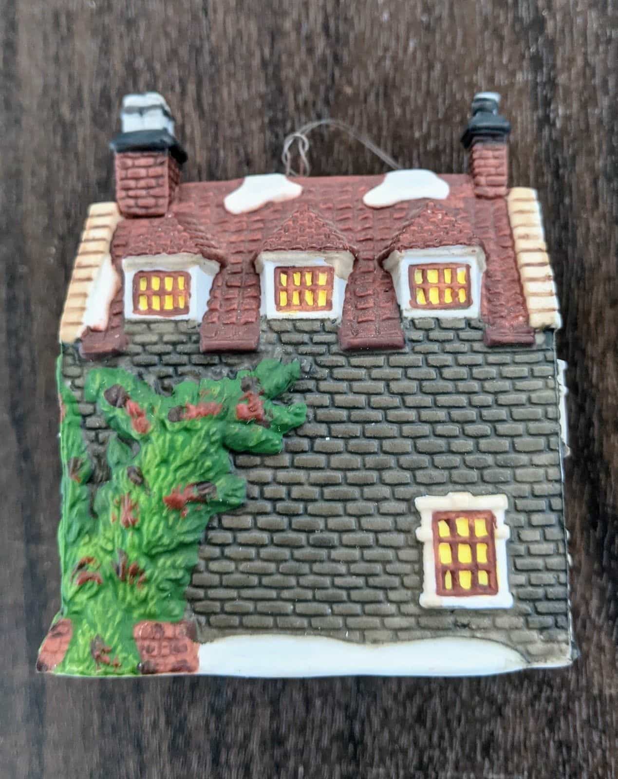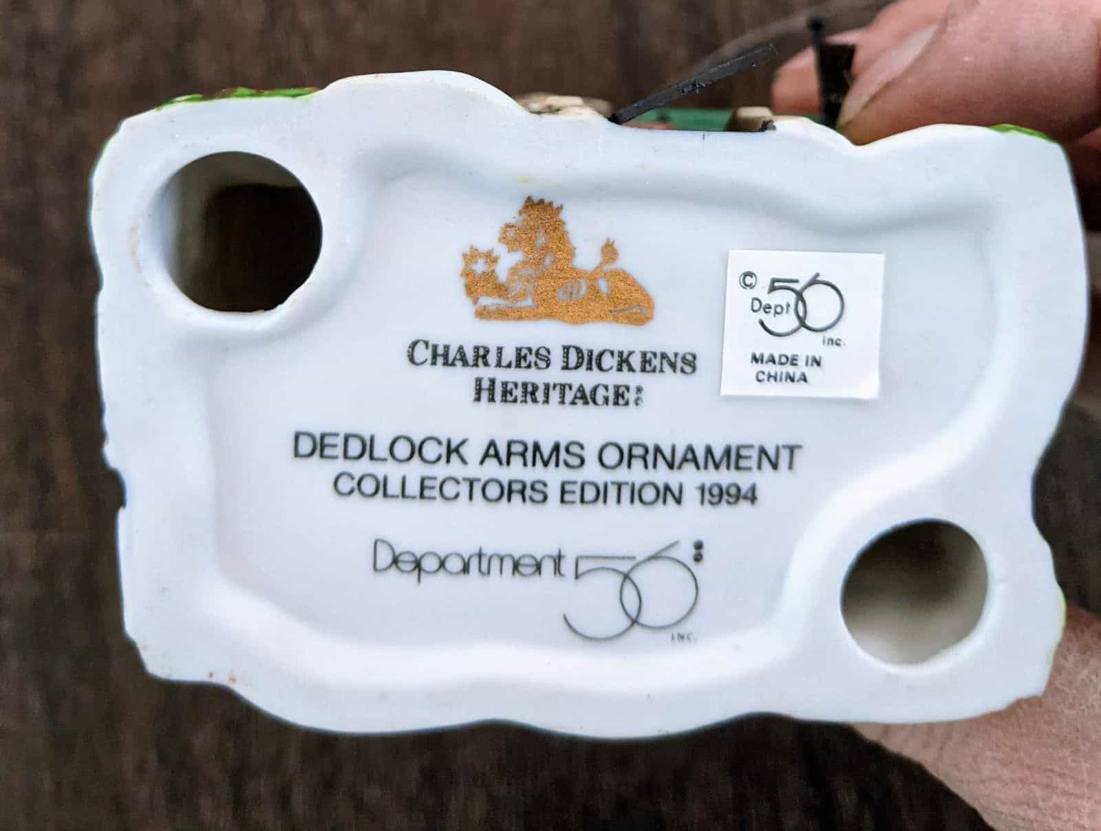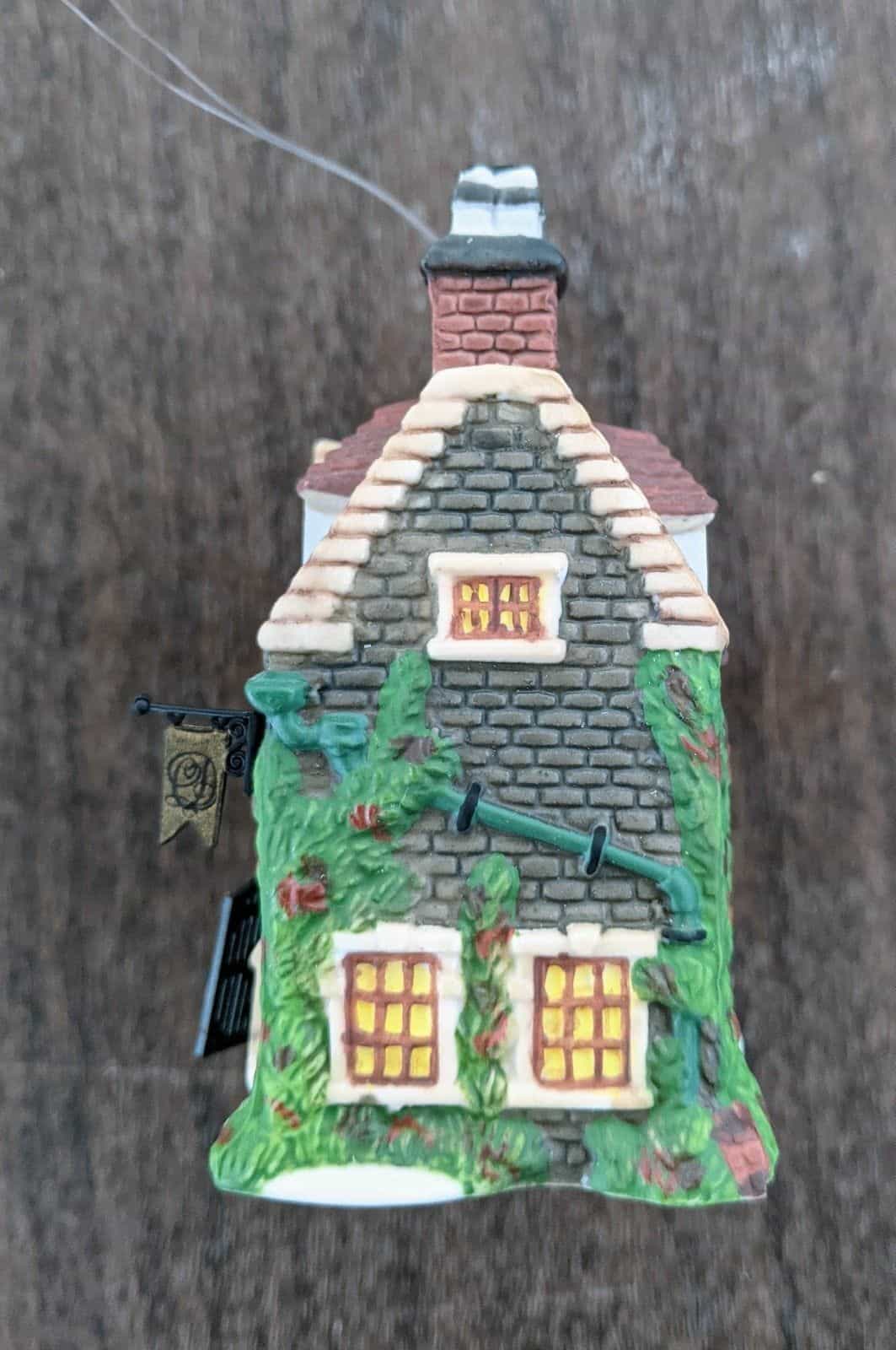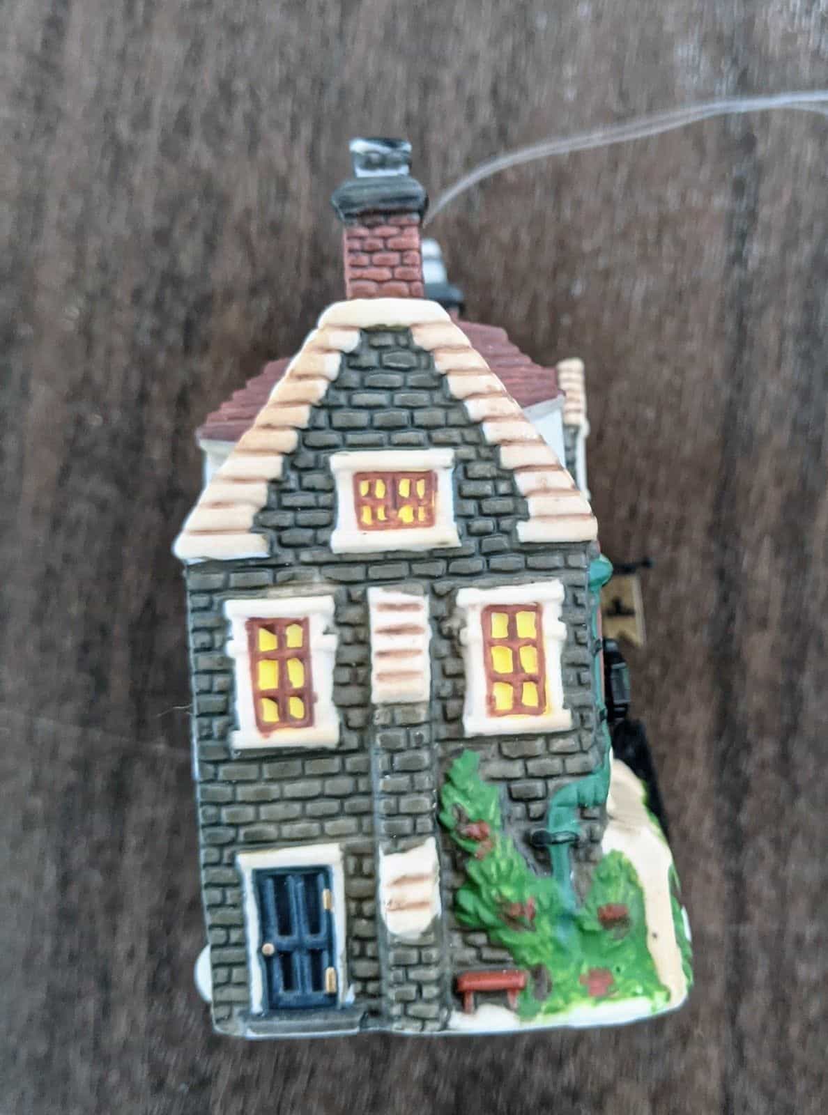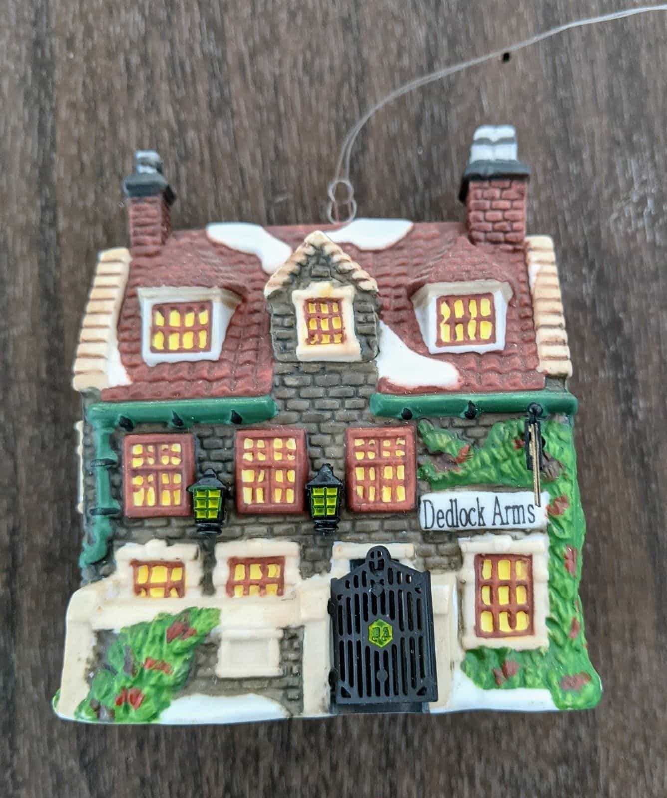 Comes in original box. Has a hook and string to be hung as an ornament but can also be added to a village. Measures about 3 1/2 inches by 3 inches by 1 1/2 inches. Made in 1994. This is the Dedlock Arms building ornament from the Charles Dickens Heritage collection.