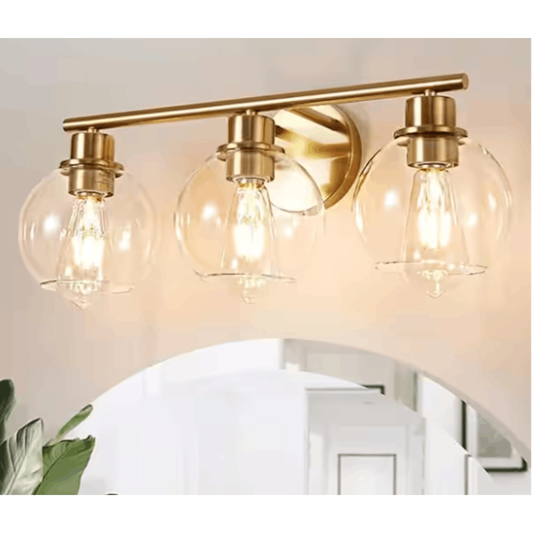 This 3-Light modern gold bathroom vanity light brings a classic mid-century charm to your home. With clear globes and slender, curved arms, it retains a vintage touch while embracing modern and transitional vibes with hand-painted gold accents. Designed for easy installation in damp locations such as bathrooms and powder rooms, this fixture also complements other gold or champagne-toned accents in your space. It provides a warm and ample glow, diffusing light upward or downward to enhance your environment.