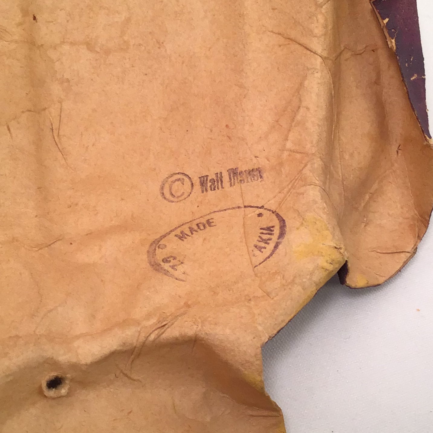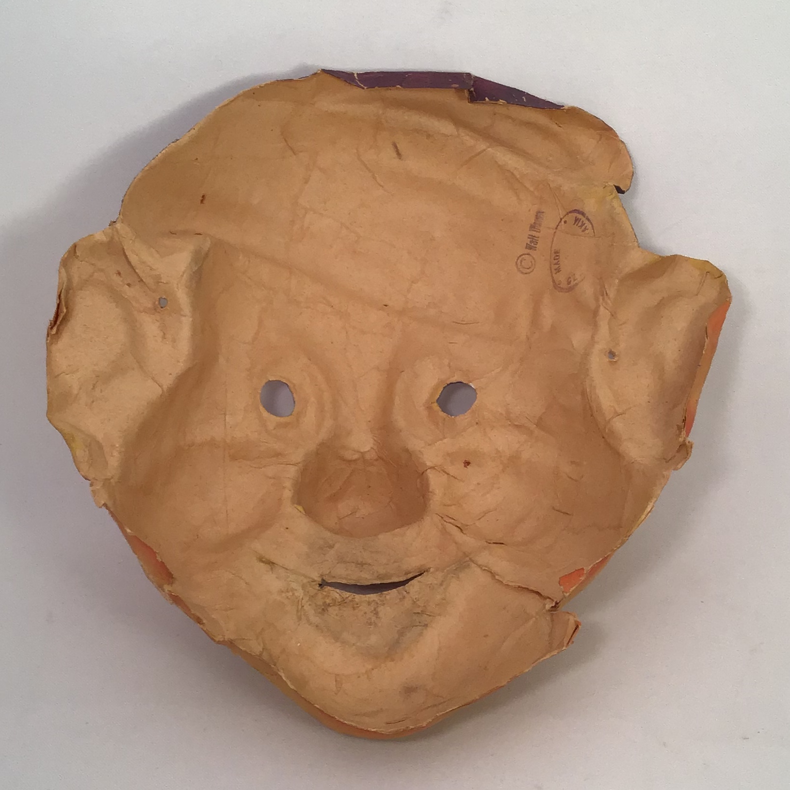 From the Walt Disney 1938 classic movie Snow White and the Seven Dwarfs, here’s a vintage Dopey Paper Mache Halloween Mask. Adult size. Made in Czechoslovakia.