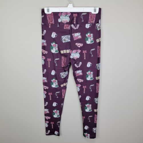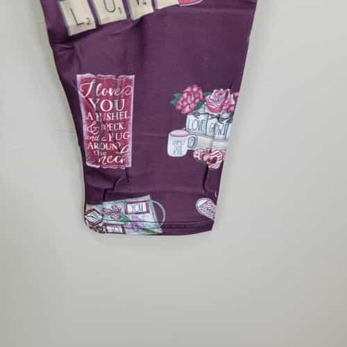 Soft and comfy pair of plum leggings made of polyester and spandex with a pretty love theme and a wide waistband!