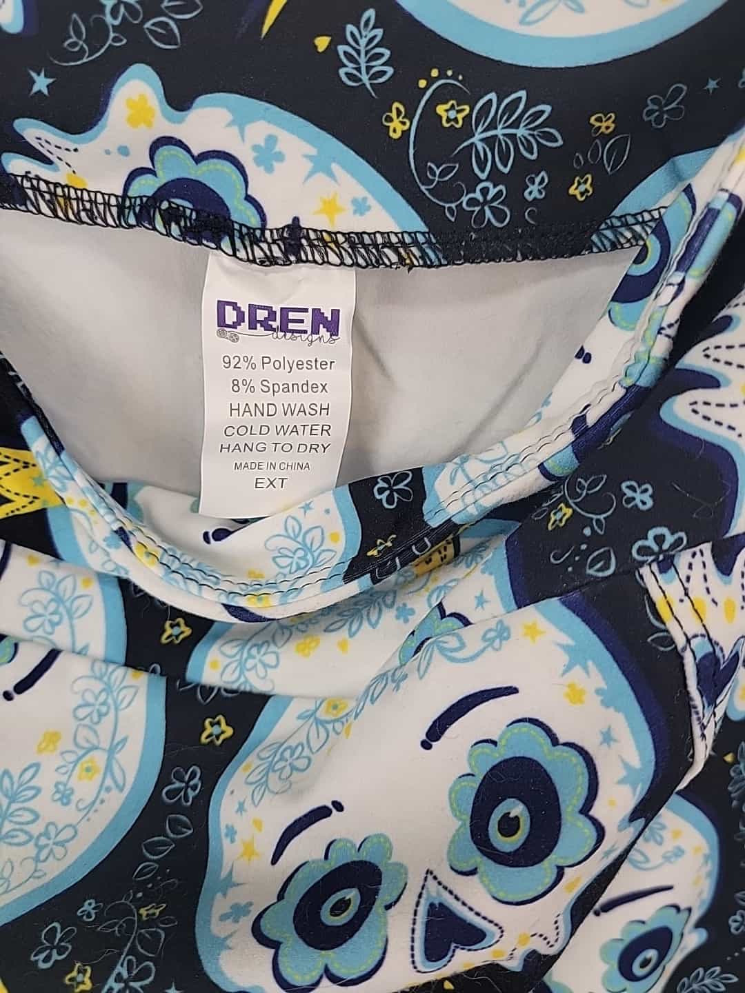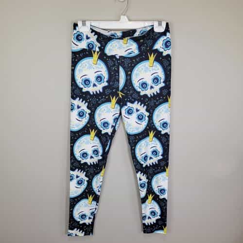 Soft and comfy pair of leggings made of polyester and spandex with a royal sugar skull print and a wide waistband!