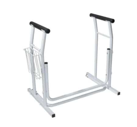 The Stand Alone Toilet Safety Rail by Drive Medical fits most standard and elongated toilets. It comes with padded armrest for added comfort and a magazine rack for added convenience. Easy, tool free assembly.