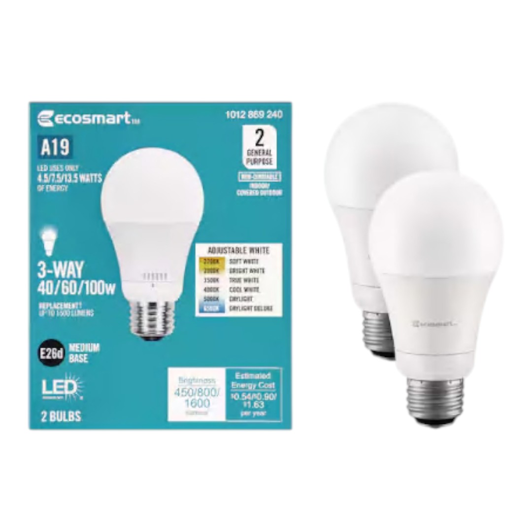The EcoSmart 3-way A19 LED light bulbs are designed for use in 3-way lamps, offering three levels of brightness to customize lighting for your room. Each setting mimics the output of a traditional 40, 60, or 100-Watt incandescent bulb. These bulbs also feature a switch to select your preferred color temperature, including Soft White (2700K), Bright White (3000K), True White (3500K), Cool White (4000K), Daylight (5000K), and Daylight Deluxe (6500K).