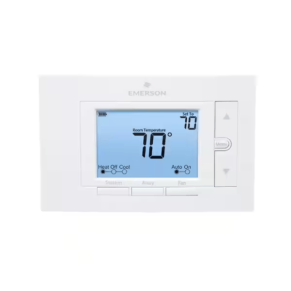 The Emerson Digital Non-Programmable Thermostat offers electronic controls and a big, clear digital display for simple control of your heating and cooling system. The backlit display allows for you to see the controls clearly. It has a precise temperature control that ranges from 45-95 degreed Fahrenheit. It’s easy to use, easy to see and has easy access to the battery compartment.