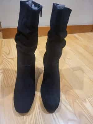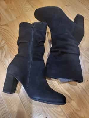 Stylish Eric Michael Poppy women’s boots featuring a classic slouchy silhouette in black leather and suede.