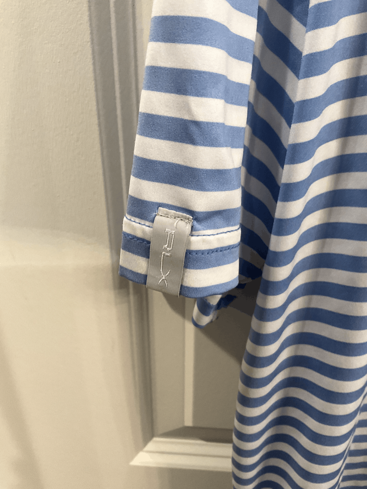 EUC RLX blue & white striped polo shirt. Collar has buttons hidden under it to keep it in place and not curling like most polo shirts. This is a signature feature of RLX shirts.