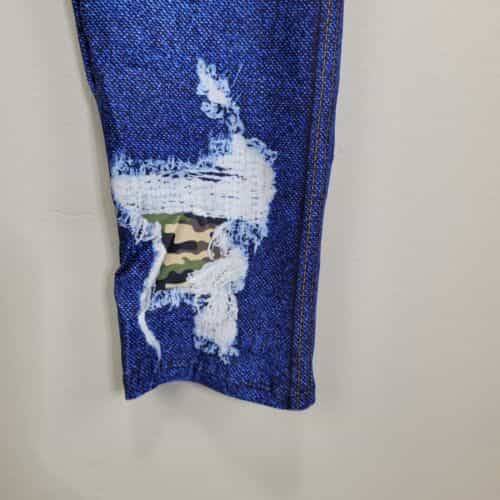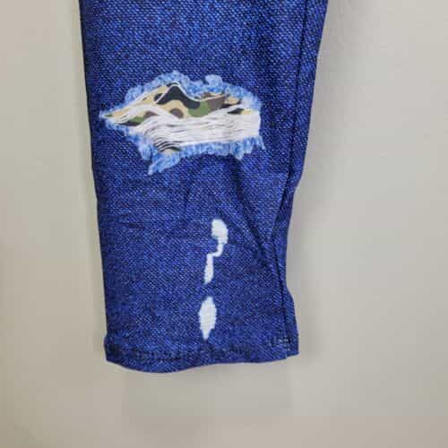 Faux distressed denim with camo “patches” on a soft and comfy pair of leggings made of polyester and spandex with a wide waistband!