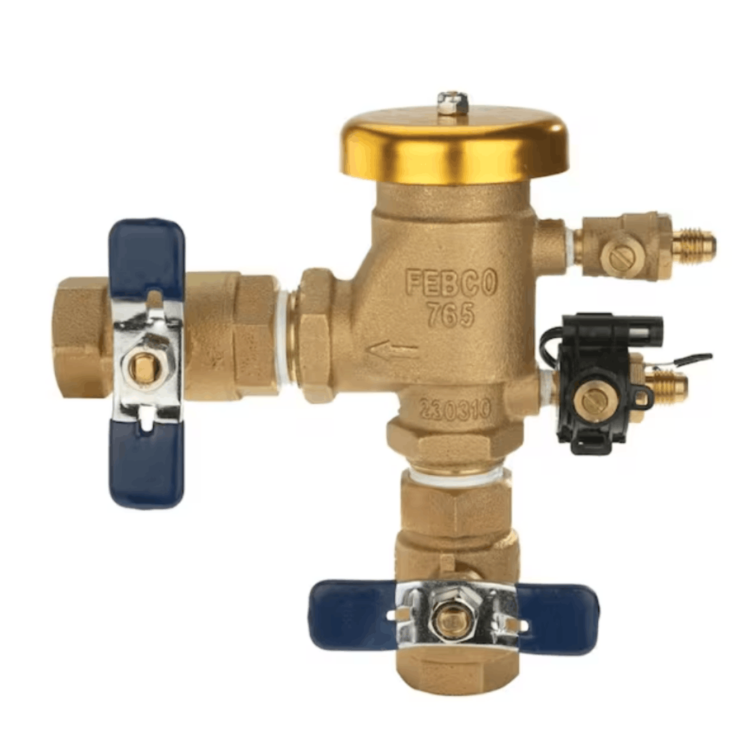 This 3/4 in. Pressure Vacuum Breaker Backflow Preventer protects against backsiphonage of toxic or non-toxic liquids in industrial plants, cooling towers, laboratories, laundries, swimming pools, and irrigation systems. Constructed with a durable bronze body, it features a spring-loaded check valve, air relief valve with opening port, two resilient-seated shutoffs, test cocks, and NPT end connections. The device operates at a maximum pressure of 150 psi (10.3 bar) and a temperature range of 32°F to 140°F (0°C to 60°C), meeting USC, FCCC, and HR Manual specifications. A freeze sensor compatible with SentryPlus Alert® technology signals when ambient temperatures approach freezing, helping protect the system from freeze damage.