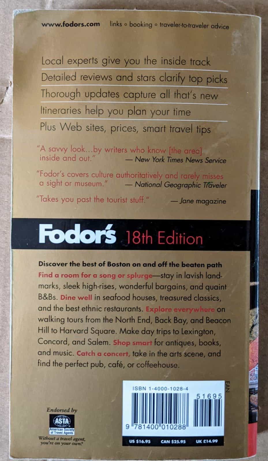 Fodor’s Boston Travel Guide Book 18th Edition- vintage 2003