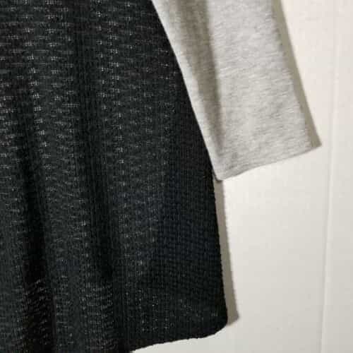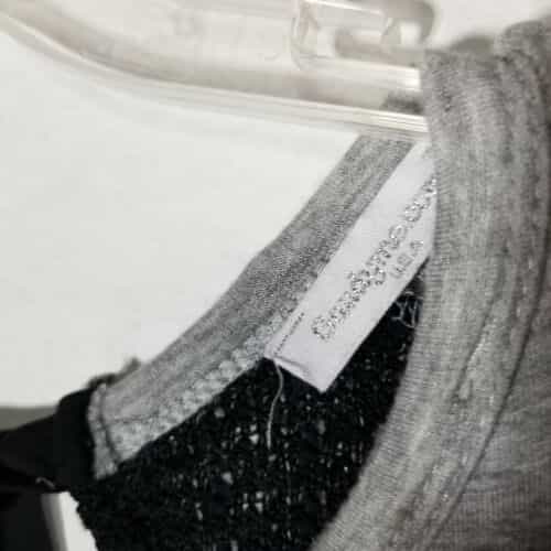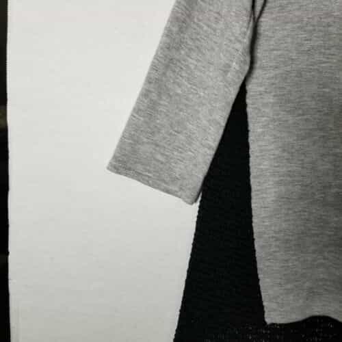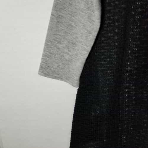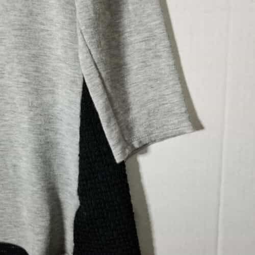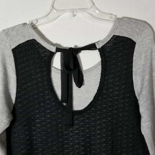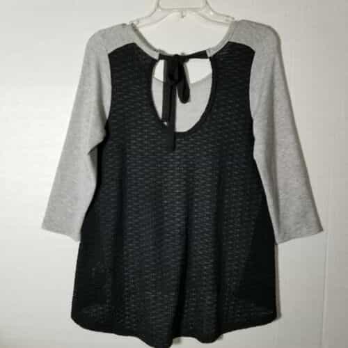 Gray and black 3/4″ sleeve hi-low knit top! Soft gray knit on front with scoop neck and an open weave black back with a large keyhole feature and black ribbon tie closure leaving part of the back open!