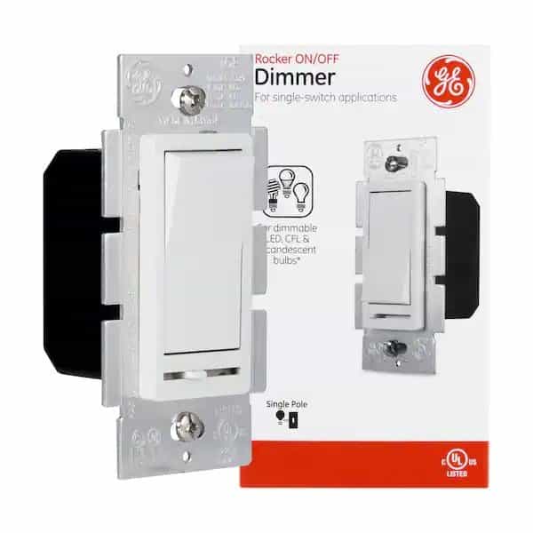 Save energy and money with the GE-branded Single Pole Slide Dimmer Rocker Switch. Ideal for replacing a standard switch, this rocker switch with sliding dimmer provides smooth dimming performance through single pole installations. Adjusting light levels with the dimmer’s full range of light controls can significantly reduce your home’s energy costs! The dimmer allows you to adjust the lighting in any room to fit any situation – turn the lights up when you have company or dim them for a movie. The rocker switch and slider come with in a bright white finish to complement existing decor, no matter your style. Compatible with single rocker traditional style wallplates, this switch features a sturdy housing with removable tabs for multigang installations. This dimmer works with incandescent, dimmable LED and dimmable CFL bulbs. Use indoors only with one-switch, permanently installed incandescent lighting fixtures – wallplate not included. This product is UL listed and backed by a one-year no-hassle replacement policy. Update your current lighting with a GE-branded Single Pole Slide Dimmer Rocker Switch.
