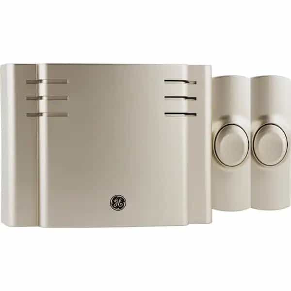 GE 30393 Satin Nickel, Wireless Door Bell Kit, 8 Melodies, 1 Receiver, 2 Push Buttons, Battery-Operated