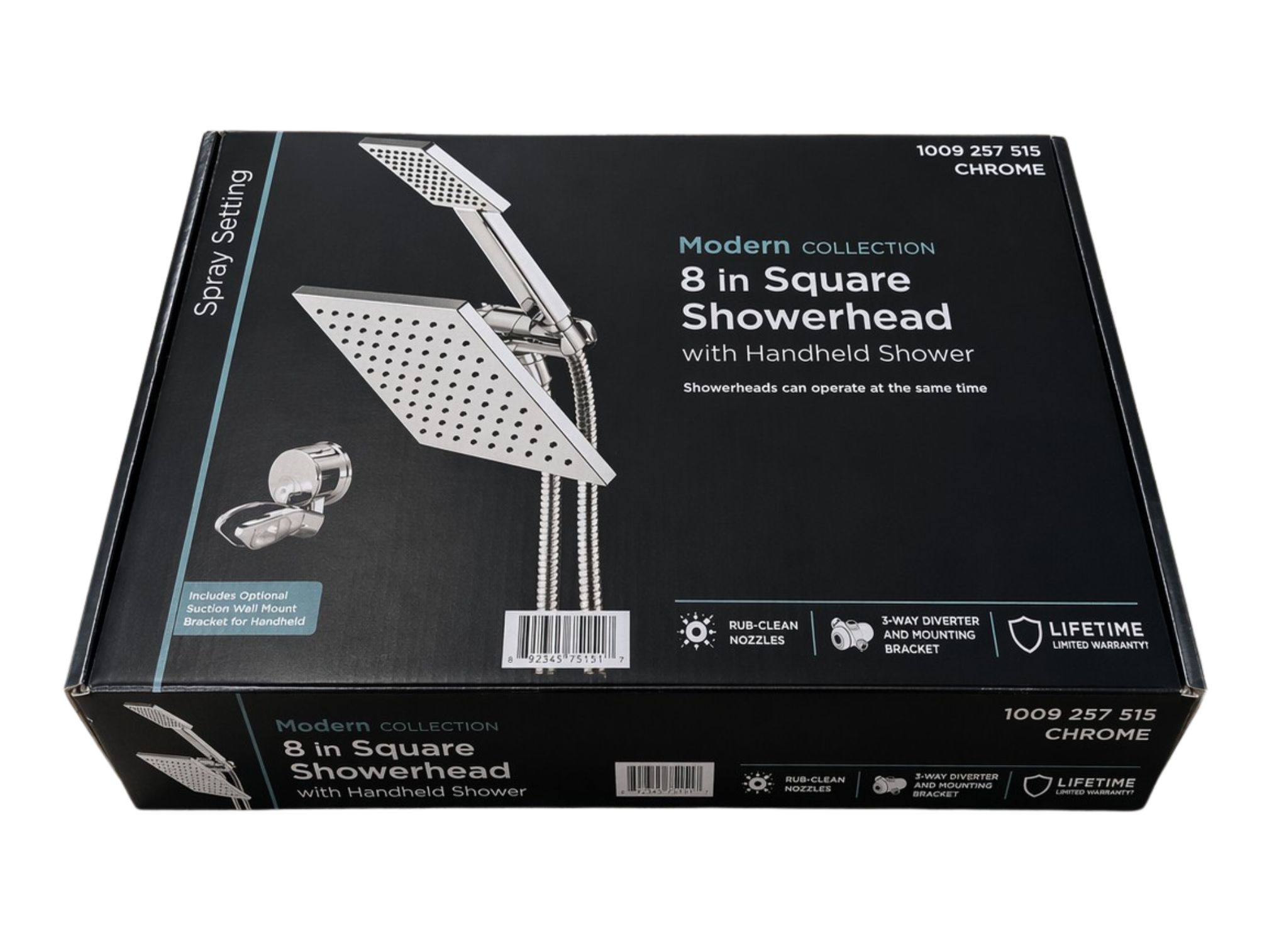 This modern wall-mounted shower system in polished chrome features a distinctive design to refresh your shower space. It includes a 7.9 in. square rain shower head with 1-spray setting and a handheld hand shower with a 60 in. stainless steel hose for flexible use. Designed to help reduce water use while maintaining good flow, it has a 1.8 GPM rate and is easy to install.