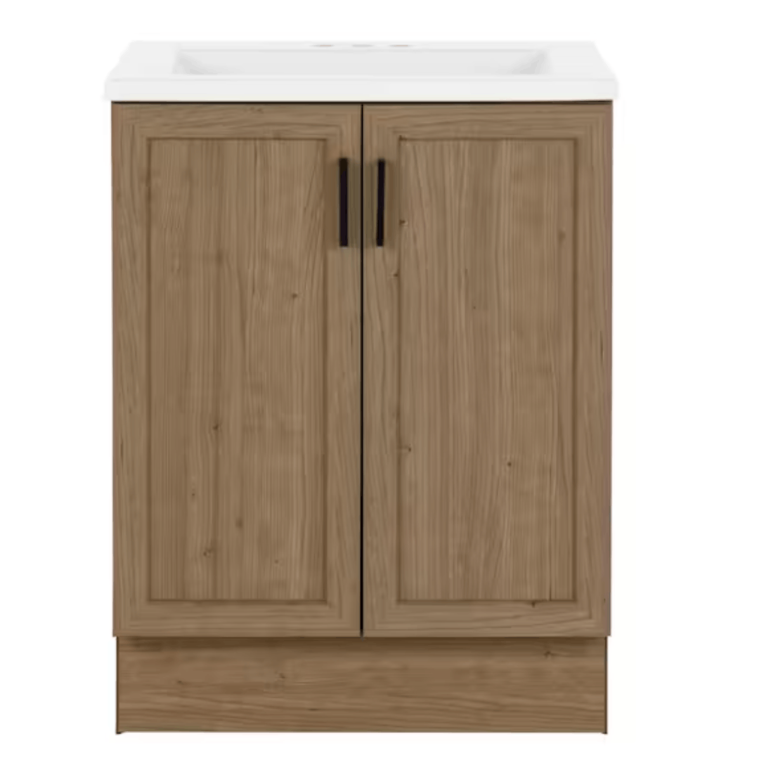 The 24.5 in. Fonthill bathroom vanity in sand elm brings both style and smart storage to small bathrooms and powder rooms. Its engineered wood cabinet features a 2-door design with an interior adjustable shelf, offering practical organization for everyday essentials. The transitional Shaker-style profile is finished in a warm, medium-toned woodgrain and accented with sleek matte black hardware. Topped with a soft white, 1-piece cultured marble vanity top and integrated rectangular sink, this vanity blends form and function. Designed for quick installation, it includes an open back, 6-way adjustable door hinges, and an unattached top for easy setup.