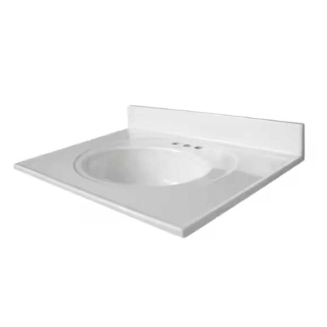 Enhance your bathroom vanity with the Glacier Bay 31 in. W x 22 in. D cultured marble vanity top in white. Designed for convenience, this seamless 1-piece vanity top features a smooth, nonporous surface that resists bacteria, mold, and mildew for easy maintenance. Made to fit a standard 30 in. W x 21 in. D floating or freestanding vanity cabinet, it includes a centered integrated round sink without an overflow hole to help maintain a cleaner environment. An integrated 3.75 in. H backsplash helps protect walls from water splashes, while predrilled faucet holes accommodate a 4 in. center set faucet of your choice. This vanity top installs easily with silicone caulking (sold separately).