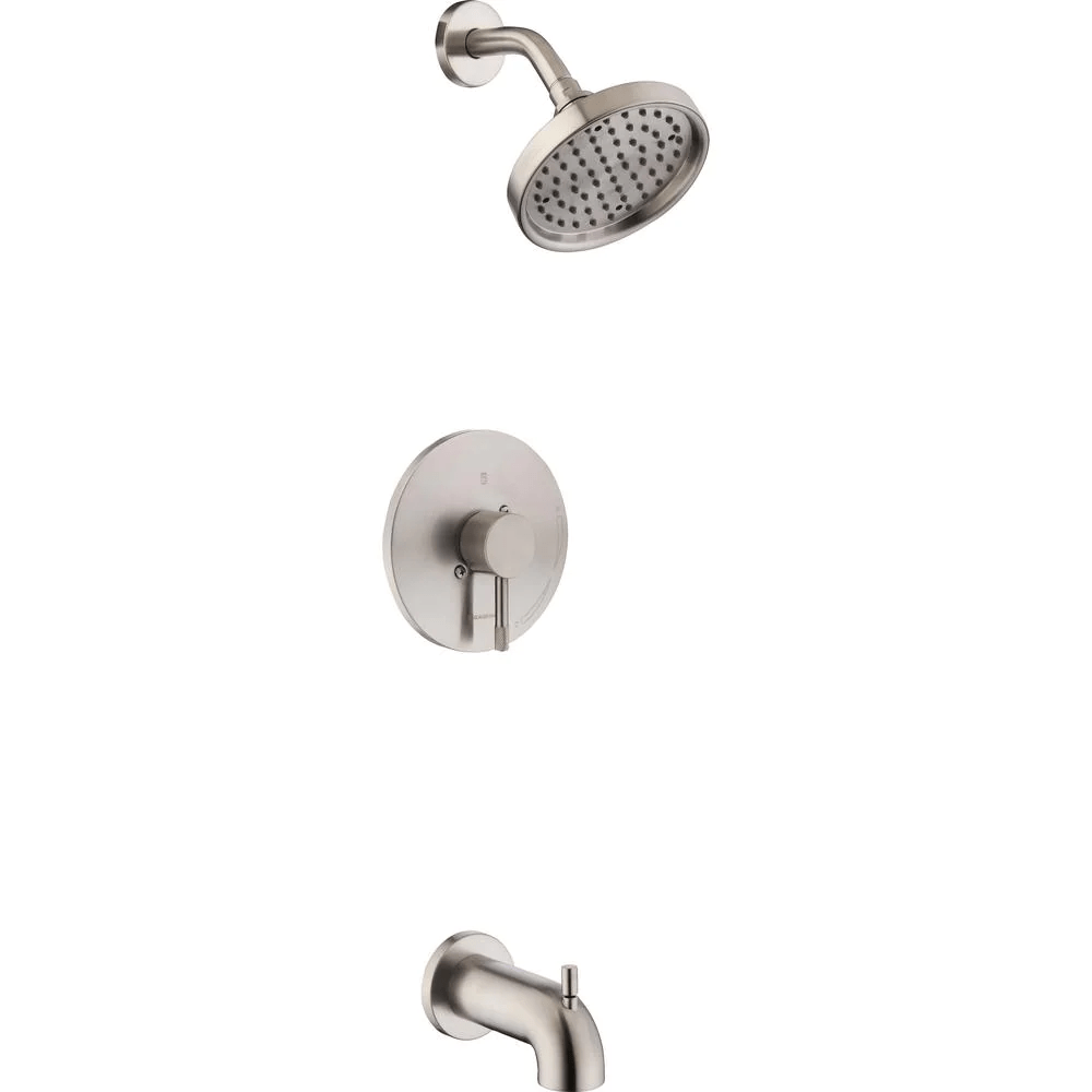 Glacier Bay Axel Single-Handle 1-Spray Tub and Shower Faucet in Brushed Nickel features a contemporary design and beautiful finish. The faucet maintains a consistant temperature for safety and comfort. It has a solid brass valve body to ensure a long lifespan and is WaterSense certified with a 1.8 GPM flow rate. The ceramic disc valve ensures drip-free performance. A limited lifetime warranty is included.